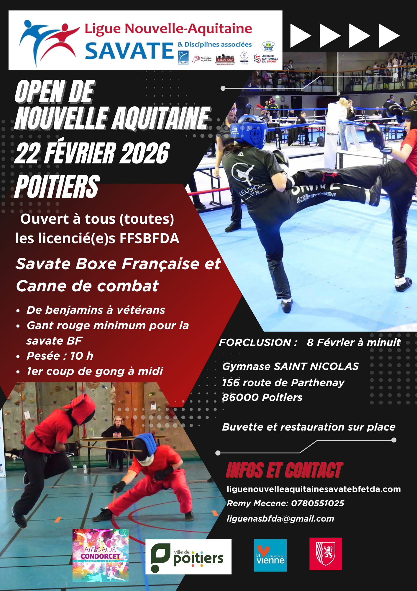 La ligue NA organise son 1er « Open de Nouvelle Aquitaine » Savate BF et canne de combat le 22 février 2026 à PoitiersLes inscriptions sont ouvertes directement dans votre espace club : https://extranet.liguenouvelleaquitainesavatebfetda.com/